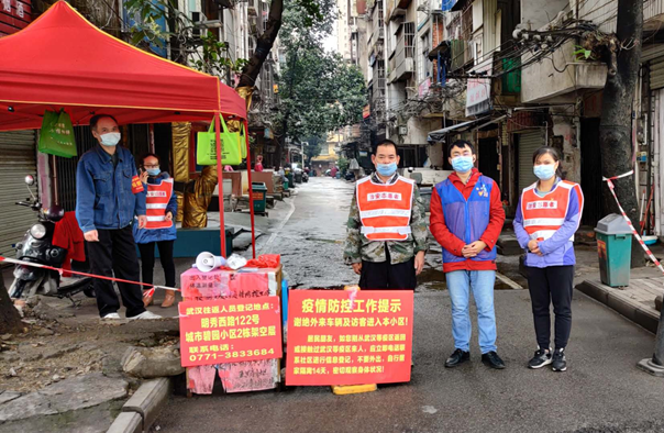 與南寧市五里亭社區工作人員共同抗擊疫情。