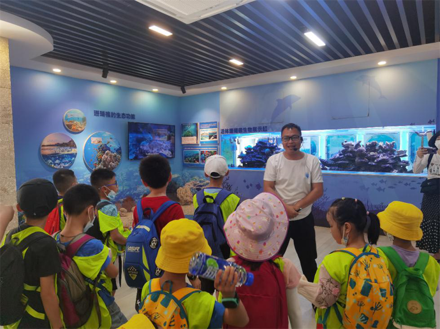 在潿洲島珊瑚館,實(shí)踐團(tuán)成員向南寧小學(xué)生科學(xué)實(shí)踐團(tuán)的小朋友們開(kāi)展海洋知識(shí)科普。結(jié)束后,成員們帶領(lǐng)小朋友前往滴水丹屏海岸線開(kāi)展“美麗海島,共同守護(hù)”凈灘活動(dòng)。