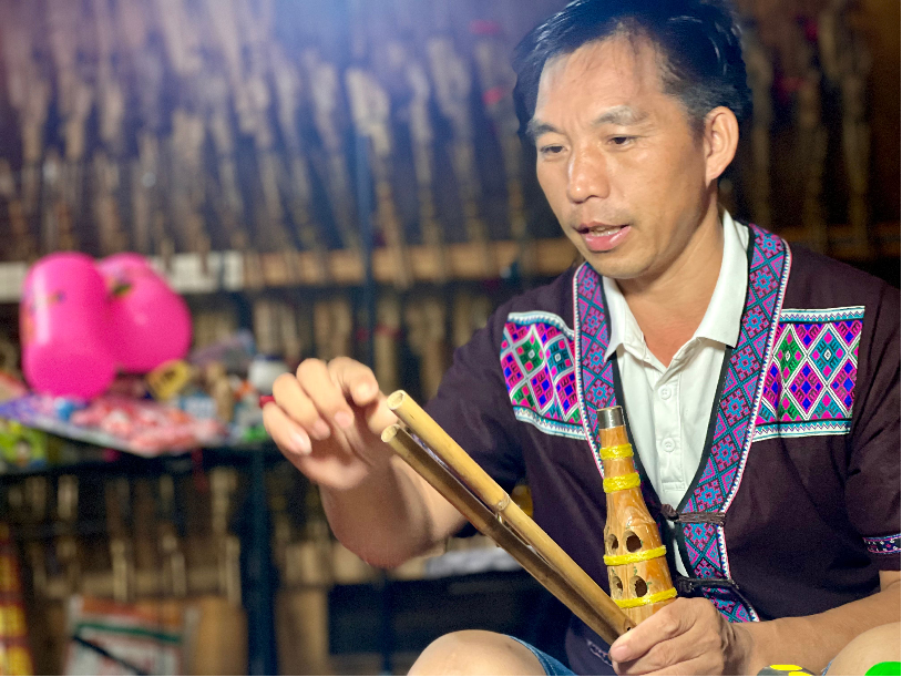 非遺手藝人馬貴光展示制作蘆笙的過程