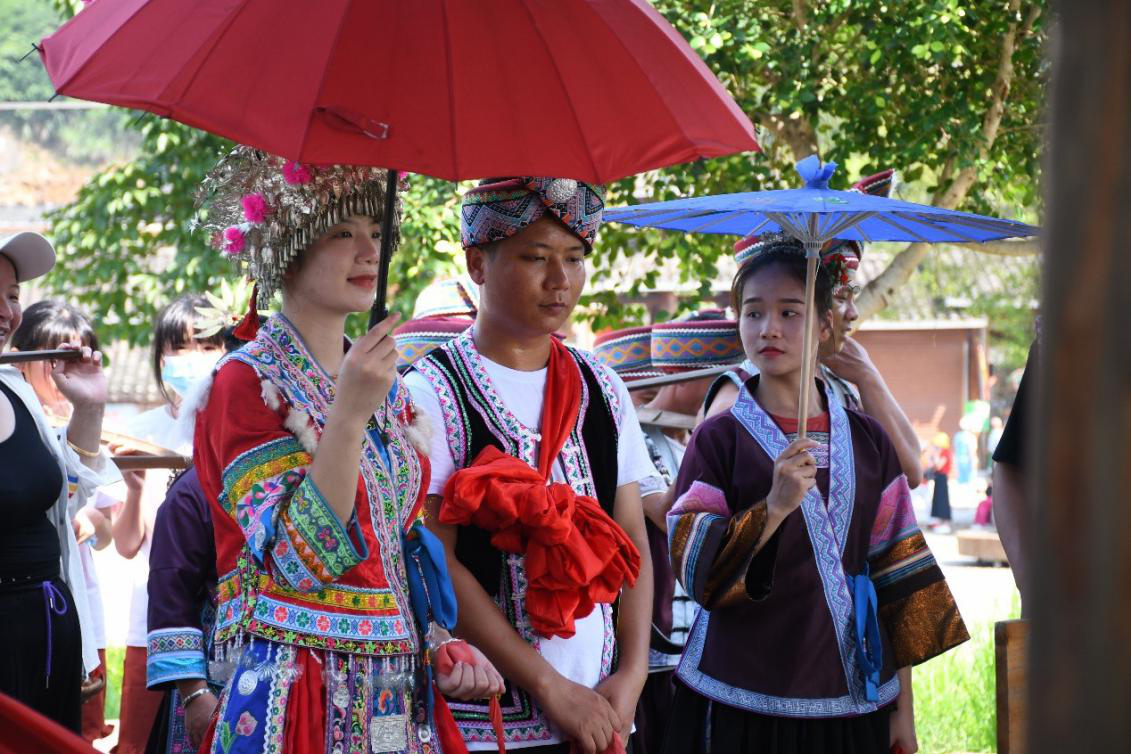 上午9點半,夢嗚苗寨的表演隊正在帶領游客體驗拋繡球、選婿、拜堂等民俗活動,據表演隊隊長潘杰輝介紹,2018年,35位表演隊員通過易地搬遷的方式搬進夢嗚苗寨,他們均為干洞鄉的貧困戶。對于他們來說,蘆笙表演不僅是增收的渠道,也能傳承和發揚苗族傳統文化。
