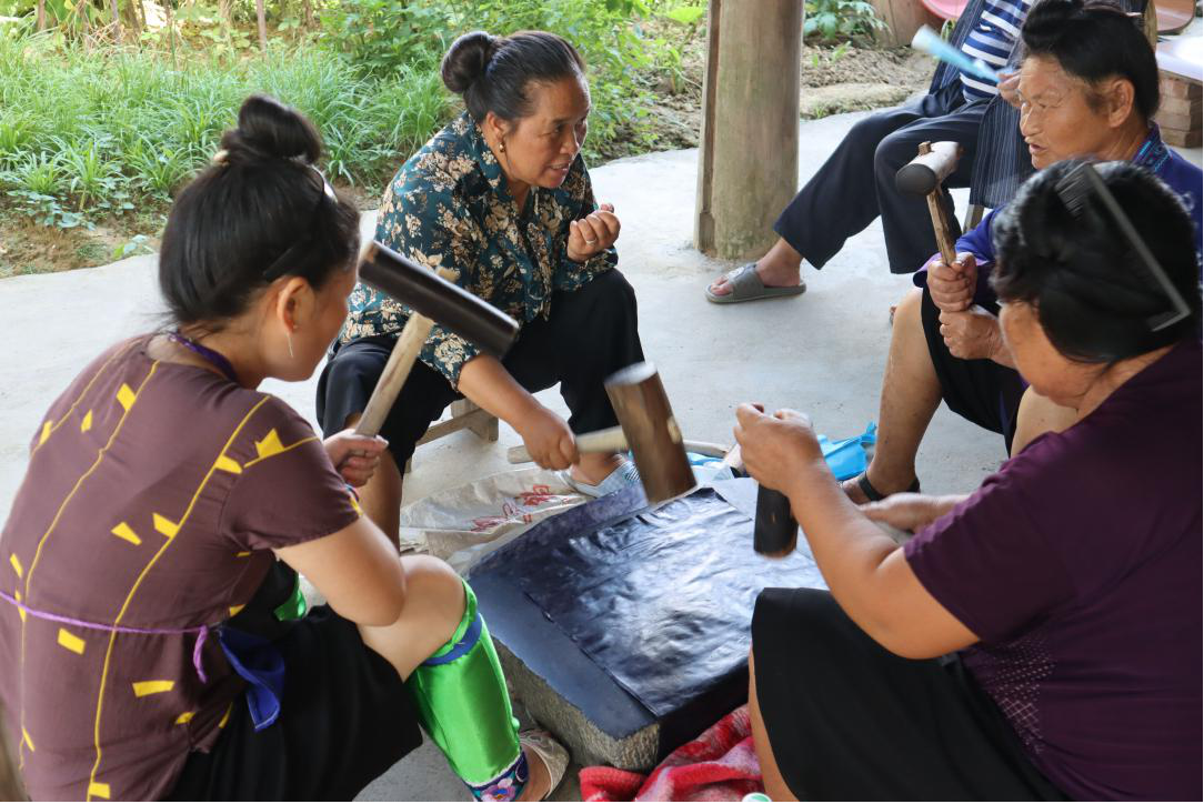 學院師生還觀看了當地織錦和亮布的制作過程。據了解,苗族織錦以自由靈活的裝飾紋樣為主,主要用于背帶蓋、被面、床單等,也可用于鑲嵌衣領、衣袖等。制作亮布則是用天然原料將布料染色,晾干后涂蛋清,用木槌反復捶打,使布面長久保持光澤。家家戶戶織錦布,苗寨處處錘衣聲,成為融水苗鄉獨特的風景線。