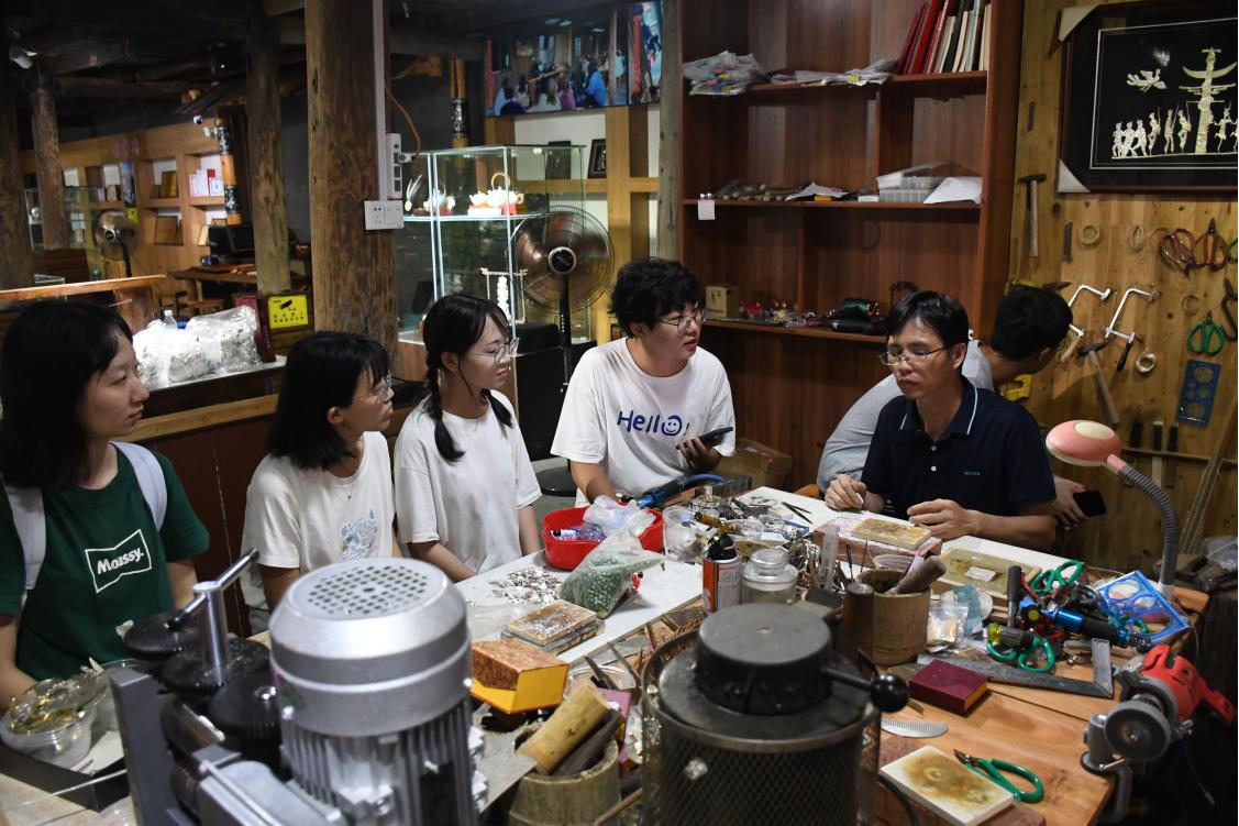 在馬貴兵的帶領下,同學們在非遺體驗館中參觀極具苗族特色的銀飾,并親身體驗了苗族銀飾的制作過程。
