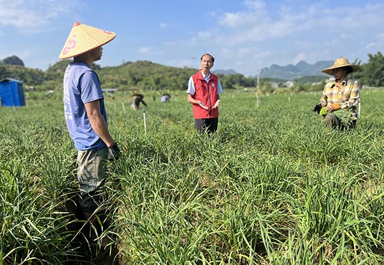 唐小付(中)到喬利鄉樂圩村指導韭菜花生產。陳宏昊攝