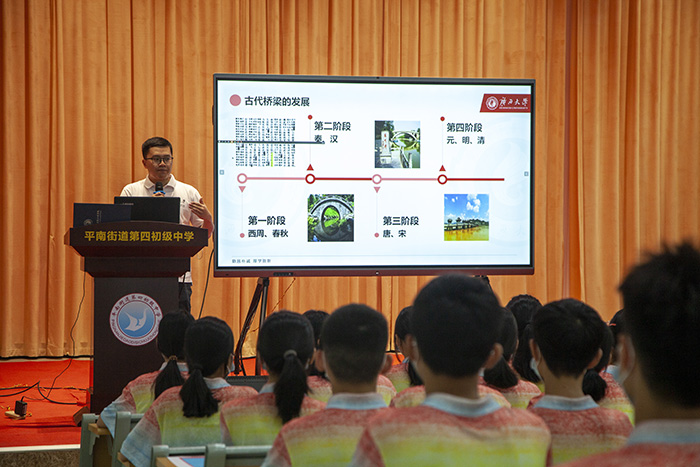 近日,廣西大學“匠心筑橋”宣講團到廣西貴港市平南縣,與平南街道第四初級中學的學生們“手牽手”開展社會實踐活動。宣講團師生通過開展橋梁知識科普宣講會、實地參觀平南三橋、搭橋建模比賽等形式,讓同學們在了解中國橋梁發展中感受祖國的強大,在思考設計及動手制作中培養科學態度和科學精神,在實踐參觀中感受以鄭皆連院士為代表的橋梁科研工作者勇攀高峰、精益求精的工匠精神和精忠愛國、心系民生的家國情懷。