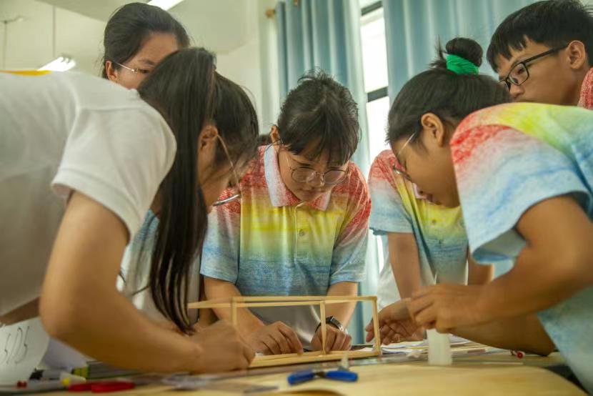 在平南四中,宣講團成員作為指導老師與同學組隊,分組進行橋梁建模比賽,旨在通過動手搭建讓同學們感受到筑橋魅力。賽事開始后,各組成員進行組裝部件打磨,橋拱制作以及橋面制作,最后進行粘接、拼裝與加固。制作過程中,同學們就模型的結構設計、受力問題,粘接問題進行請教,最終合力完成受力穩固的拱橋模型。