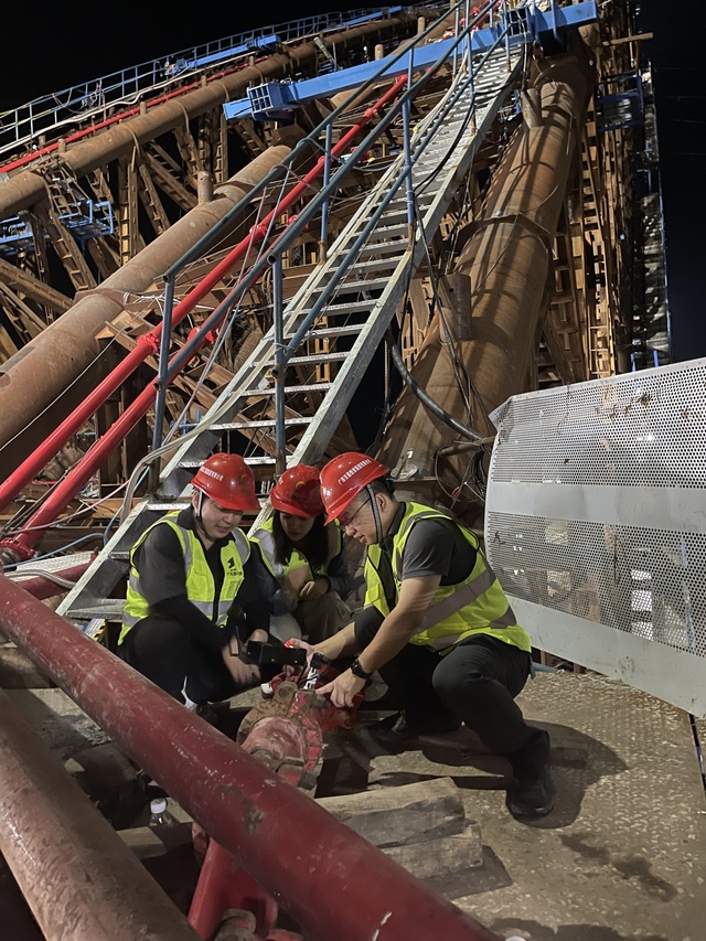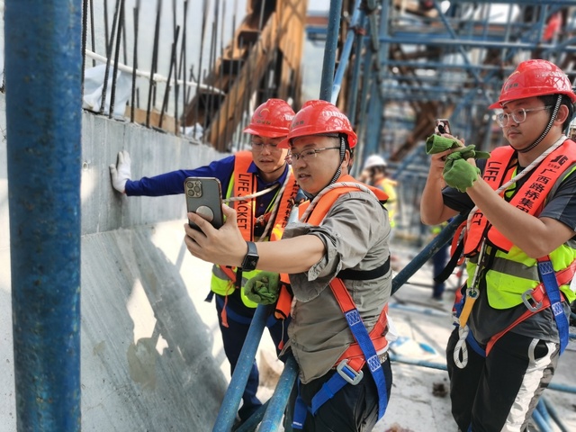 大橋項目總工程師羅小斌和陳正教授在拱上通過視頻通話向鄭皆連院士匯報澆筑質量檢查情況。