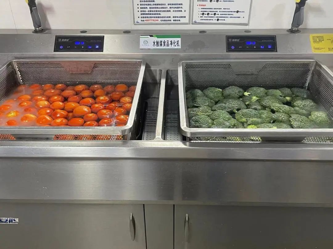 為保證果蔬的干凈安全,食堂采用自動化清洗和水觸媒凈化設(shè)備。