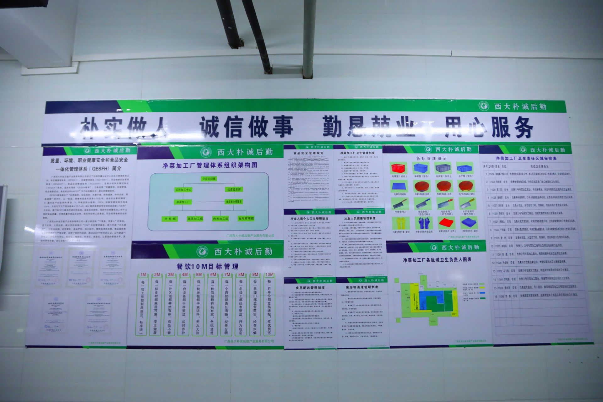 為提升后廚規(guī)范化管理水平和食堂工作人員的食品安全意識,防止食品交叉污染,降低食品安全風(fēng)險(xiǎn),廣西西大樸誠后勤產(chǎn)業(yè)服務(wù)有限公司積極根據(jù)南寧市市場監(jiān)管局要求對食堂后廚推行了色標(biāo)管理和定位管理。色標(biāo)管理是精細(xì)化管理的重要核心環(huán)節(jié),不同用途的物品使用不同的顏色進(jìn)行標(biāo)記管理。比如砧板、刀具、毛巾等都使用不同的色標(biāo)進(jìn)行區(qū)分,分開使用。