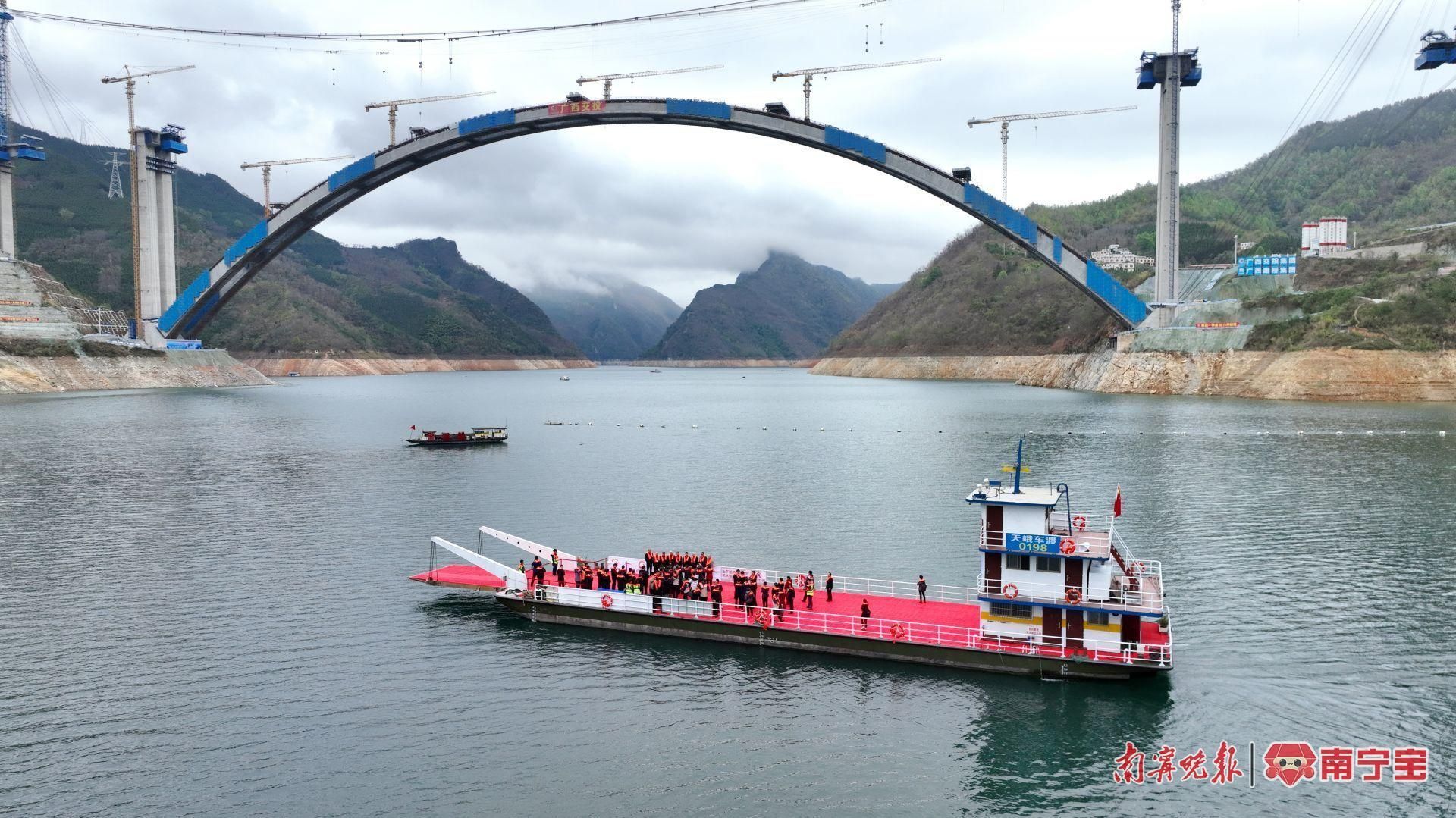 19日,記者在項目建設現(xiàn)場看到,在靜謐的紅水河上,兩岸青山之間,一座氣勢恢宏的大橋已經(jīng)芳容初露。據(jù)悉,目前大橋已完成勁性骨架吊裝合龍和管內(nèi)混凝土灌注施工,目前正在進行外包混凝土施工。廣西交通投資集團南丹至天峨下老高速公路工程建設指揮部指揮長黎水昌介紹,項目開工建設以來推進順利,大橋進度完成率約66%,預計今年年底建成通車。