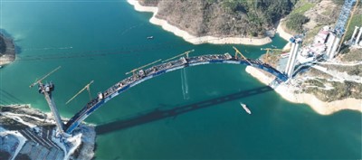 天峨龍灘特大橋位于廣西河池市天峨縣龍灘大壩上游六公里處,由鄭皆連主持建造。該橋全長近兩千五百米,其中主橋為計算跨徑六百米的上承式勁性骨架混凝土拱橋,建成后將刷新拱橋跨徑世界紀錄。圖為建設中的天峨龍灘特大橋。(攝于二〇二三年三月)