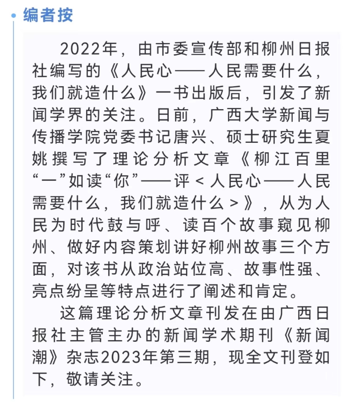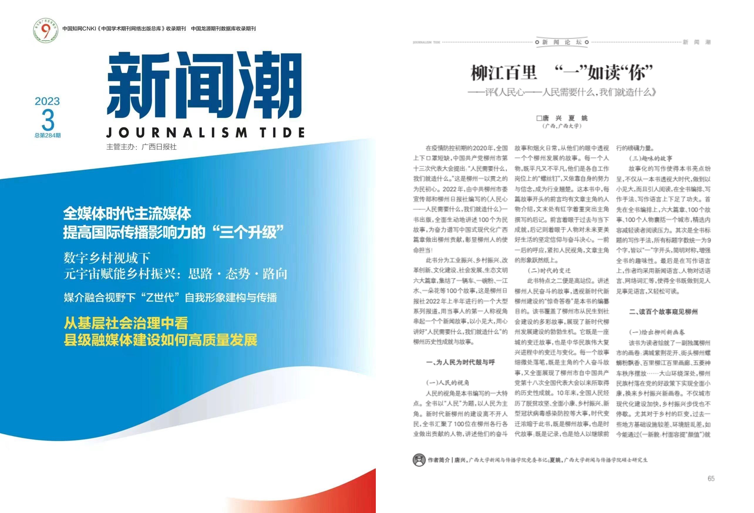 《新聞潮》刊發(fā)學(xué)界專家對(duì)《人民心》的書評(píng):柳江百里, “一”如讀“你”