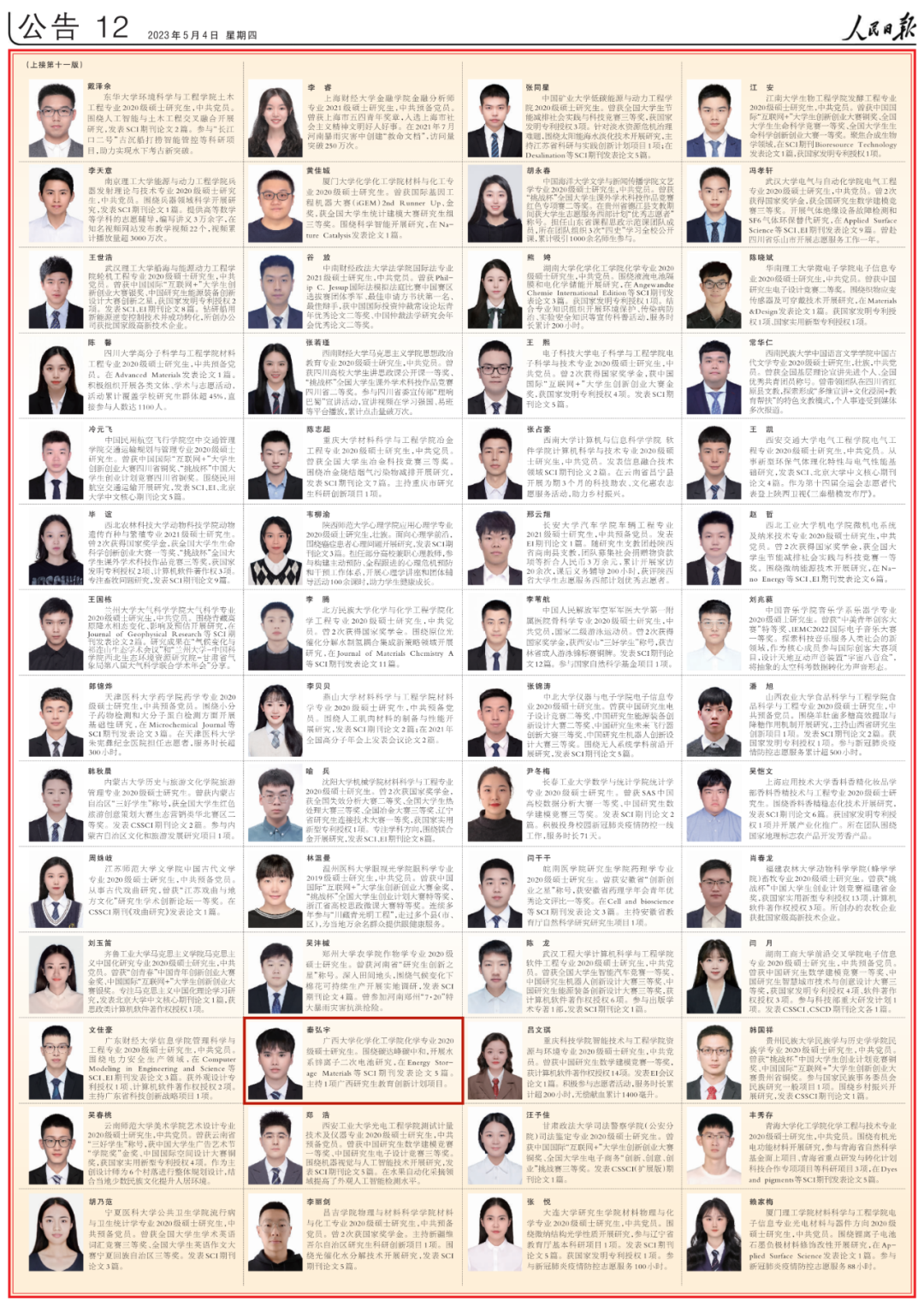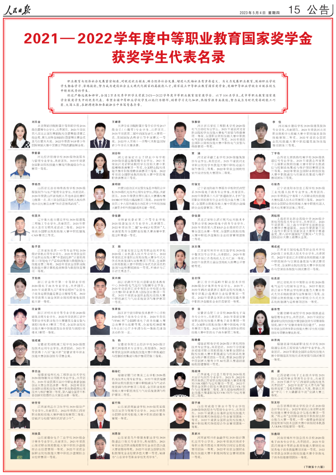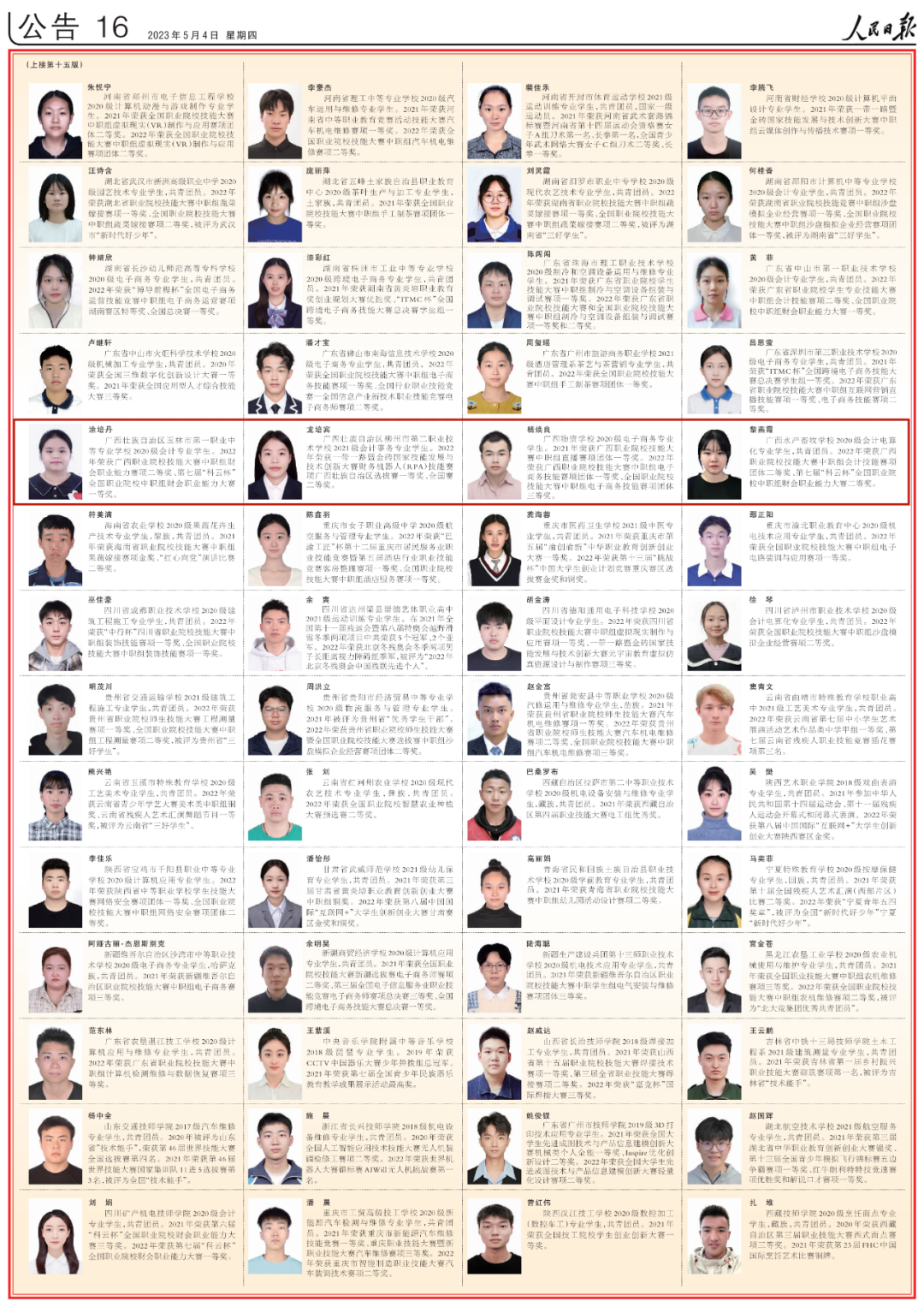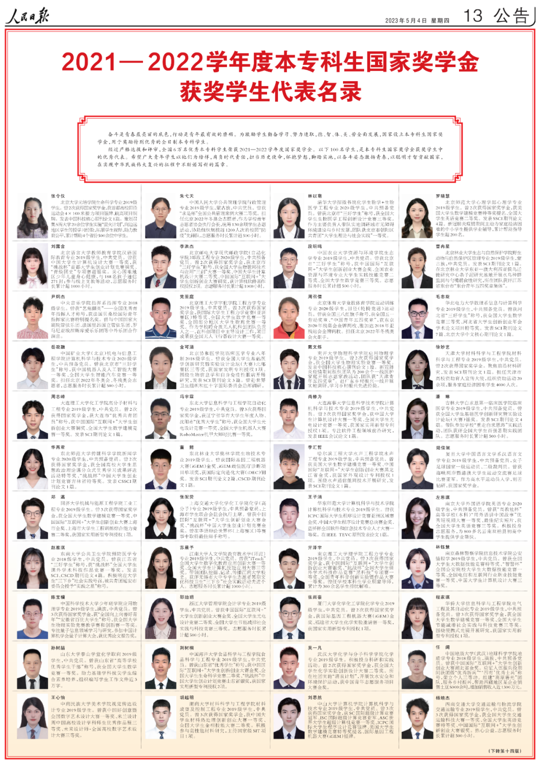 5月4日出版的人民日?qǐng)?bào),用六個(gè)整版刊登了100名研究生國(guó)家獎(jiǎng)學(xué)金獲獎(jiǎng)學(xué)生優(yōu)秀代表、100名本專科生國(guó)家獎(jiǎng)學(xué)金獲獎(jiǎng)學(xué)生優(yōu)秀代表和100名中等職業(yè)教育國(guó)家獎(jiǎng)學(xué)金獲獎(jiǎng)學(xué)生優(yōu)秀代表名錄。其中,廣西有6名優(yōu)秀學(xué)生代表榜上有名。