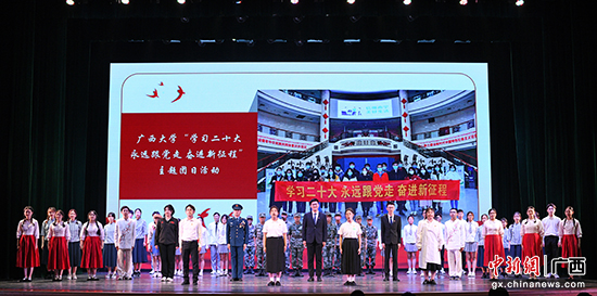 青年們?cè)婍灅s光,原創(chuàng)情景朗誦《三十歲的永恒》和情景劇《我們的青年時(shí)代》演繹了一代代青年傳承紅色基因,矢志不渝奮斗的歷程;朗誦《我們的支教故事》講述了廣西大學(xué)研究生支教團(tuán)扎根基層、接續(xù)傳承、敬業(yè)奉獻(xiàn)、“自找苦吃”的動(dòng)人事跡。