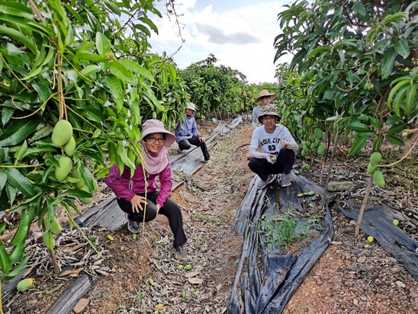 廣西右江芒果科技小院師生在果園調查芒果新栽培模式下結果數。廣西大學供圖
