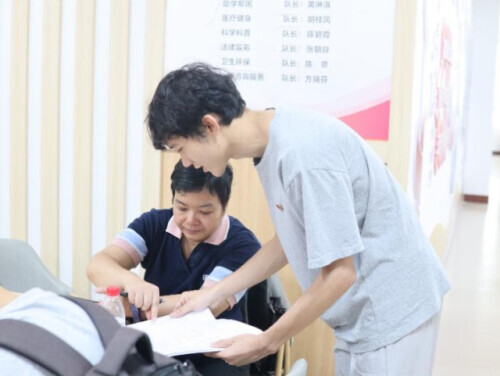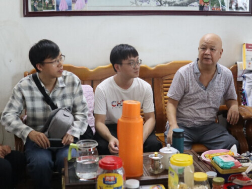 實踐團成員聆聽周海豪、楊翠蓮兩位老黨員分享梧州紅色地標建筑保護情況