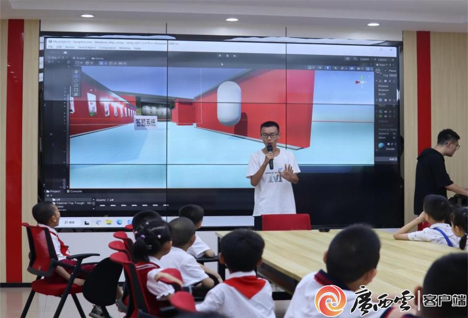 實(shí)踐團(tuán)走進(jìn)梧州市萬秀區(qū)民主社區(qū)居委會(huì),開展“臻真少年?duì)幷檎拢南螯h夢(mèng)飛揚(yáng)”活動(dòng)。實(shí)踐團(tuán)向社區(qū)師生介紹團(tuán)隊(duì)隊(duì)員自主研發(fā)的虛擬紅色場(chǎng)館系統(tǒng),系統(tǒng)將虛擬現(xiàn)實(shí)技術(shù)和紅色文化結(jié)合,打造沉浸式思政智慧課堂,具有科技感和趣味性,激發(fā)孩子們學(xué)習(xí)黨史的興趣,在這片紅色土地上賡續(xù)紅色血脈、汲取奮進(jìn)力量,在孩子們心間厚植愛黨、愛國(guó)、愛社會(huì)主義的紅色種子。