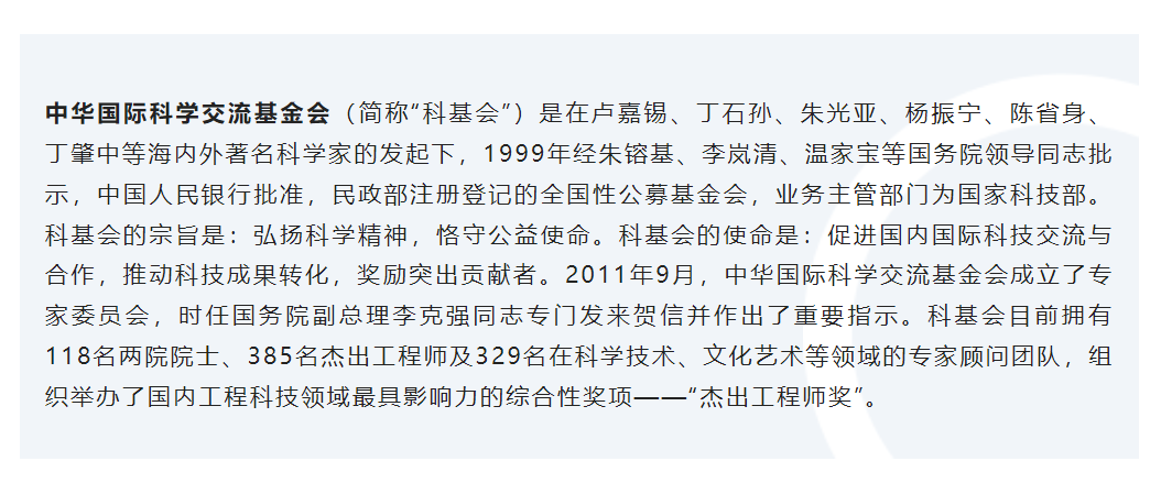 2024年11月23日,中華國際科學交流基金會第六屆“杰出工程師獎”獎勵委員會召開會議,對第六屆“杰出工程師獎”獲獎候選人進行最終審定。“杰出工程師獎”每兩年評選一次,旨在獎勵和表彰在全國生產建設科研一線做出突出貢獻的工程技術人員,迄今已評選六屆。經過多年的不懈努力,“杰出工程師獎”已成為目前涵蓋領域最廣、最具權威性的工程技術人員獎項之一。