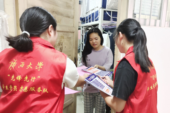 為充分發揮學生黨員先鋒模范作用,切實提高同學們對于電信網絡詐騙的防范意識和辨別能力,11月19日,廣西大學“先鋒先行”學生黨員志愿服務隊組織70余名學生黨員開展“黨建引領,反詐同行”志愿服務活動,走進1200余間學生宿舍“面對面、點對點”進行反詐宣傳。