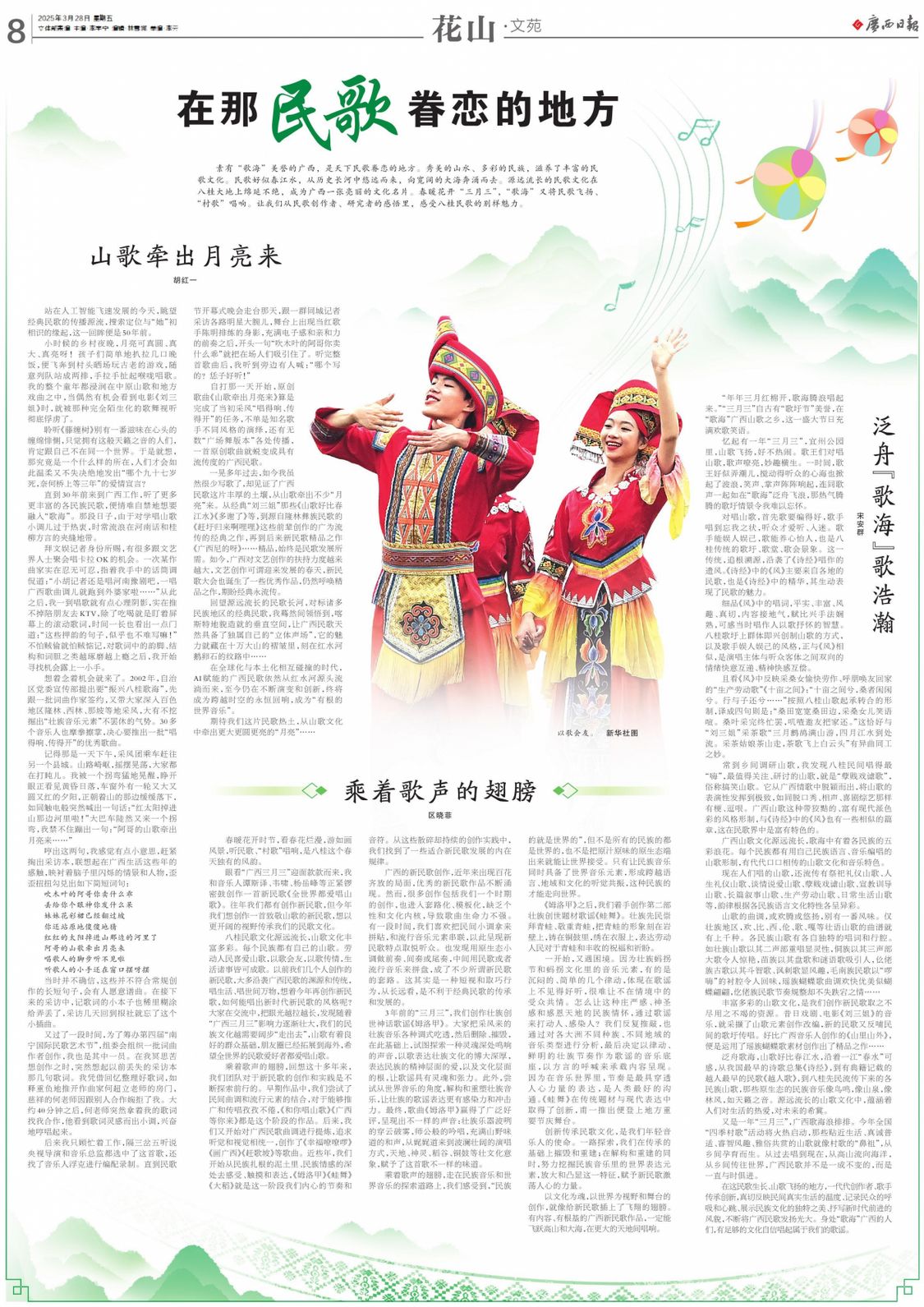 素有“歌海”美譽的廣西,是天下民歌眷戀的地方。秀美的山水、多彩的民族,滋養了豐富的民歌文化。民歌好似春江水,從歷史長河中悠遠而來,向寬闊的大海奔涌而去。源遠流長的民歌文化在八桂大地上綿延不絕,成為廣西一張亮麗的文化名片。春暖花開“三月三”,“歌海”又將民歌飛揚、“村歌”唱響。讓我們從民歌創作者、研究者的感悟里,感受八桂民歌的別樣魅力。