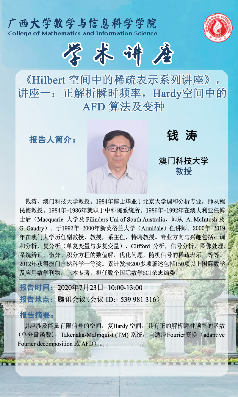 主講人 錢濤 教授 (澳門科技大學) 地址 騰訊會議 會議ID:539 981 316