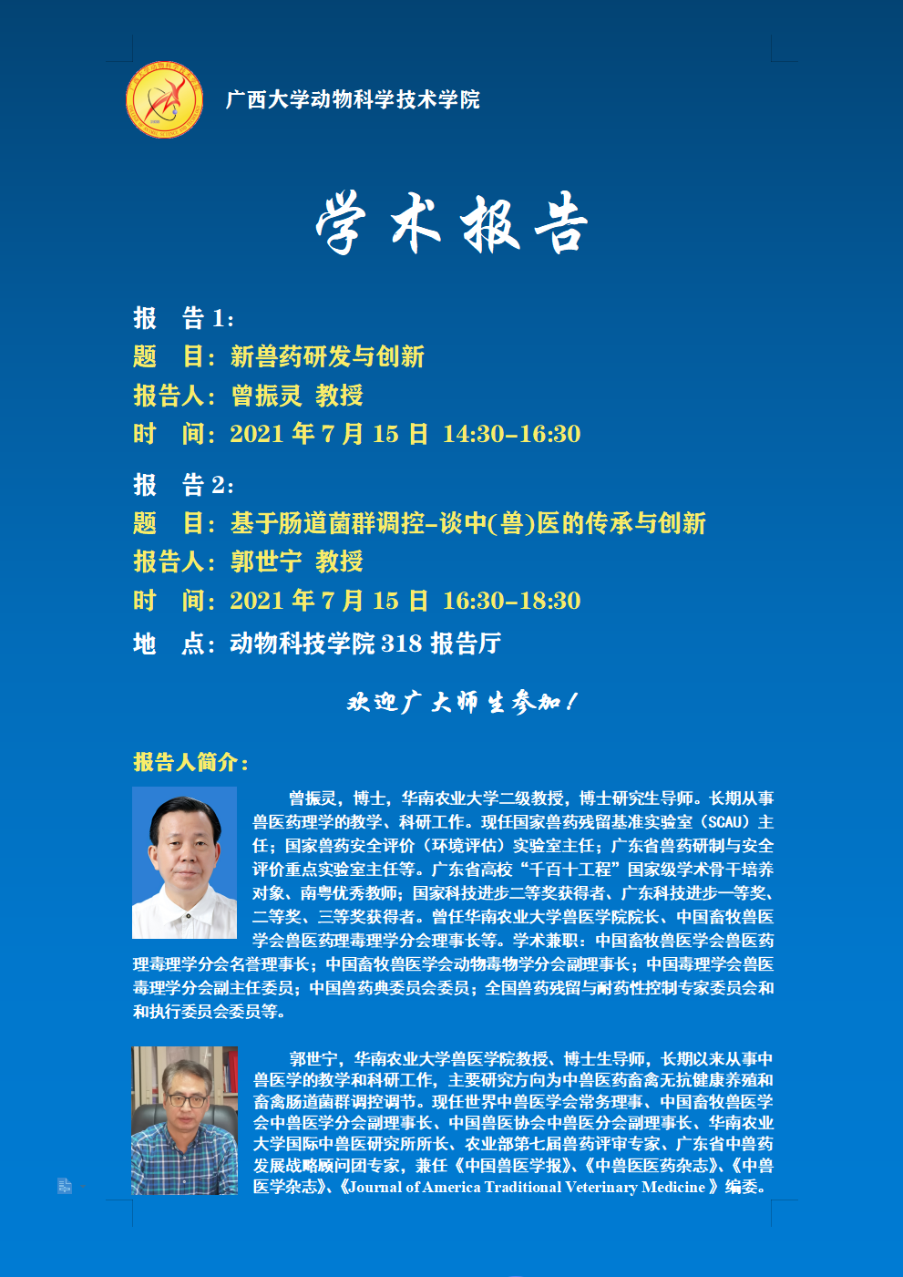 主講人 曾振靈 郭世寧 地址 動物科學技術學院318報告廳