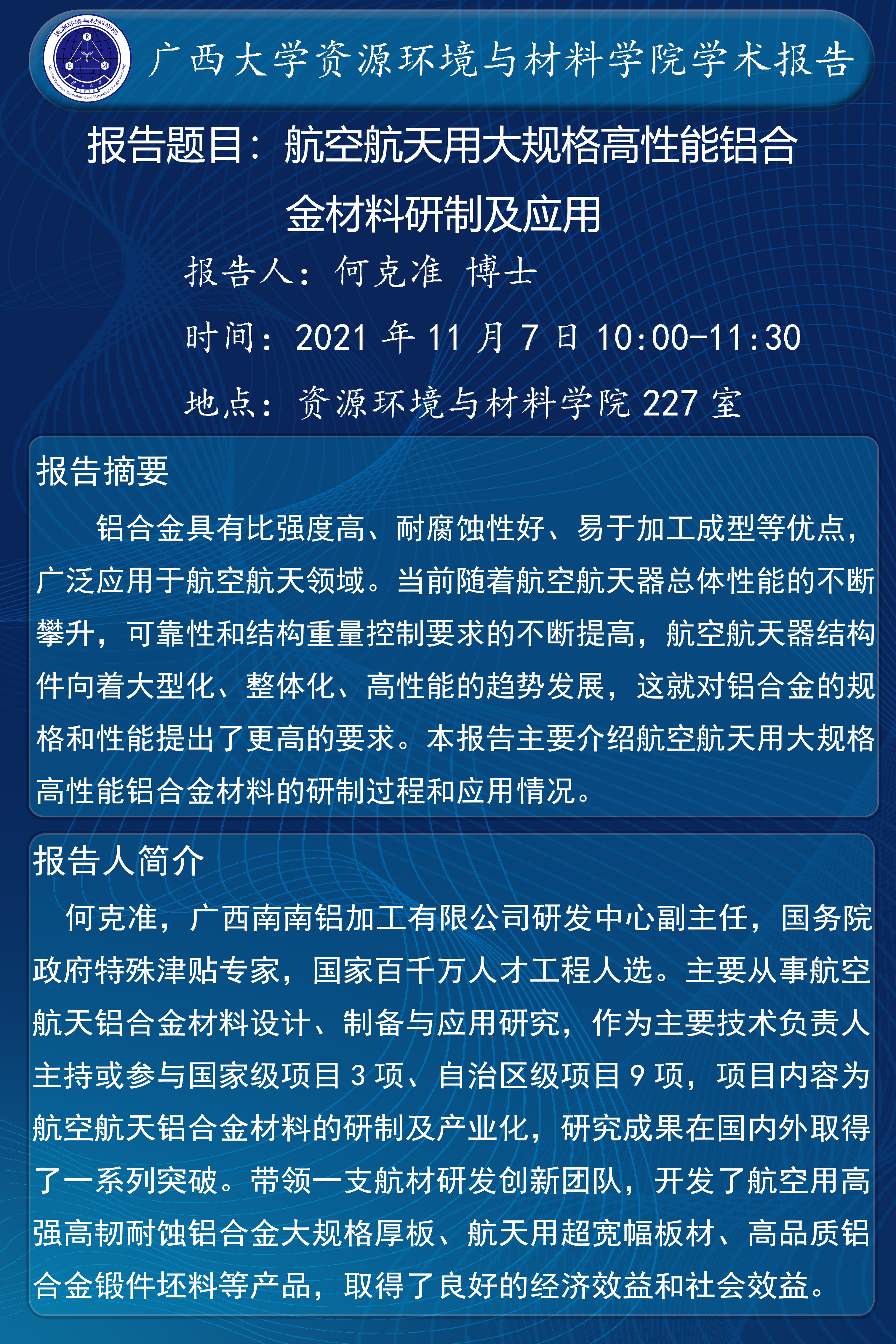 資源環(huán)境與材料學院學術(shù)報告:航空航天用大規(guī)格高性能鋁合金材料研制及應用