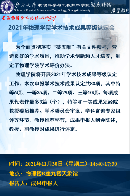 物理學院星海物語學術論壇(第十三期):2021年物理學院學術技術成果等級認定會