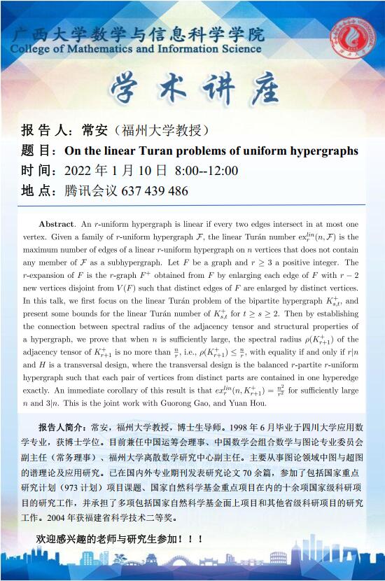 數信學院學術報告: On the linear Turan problems of uniform hypergraphs