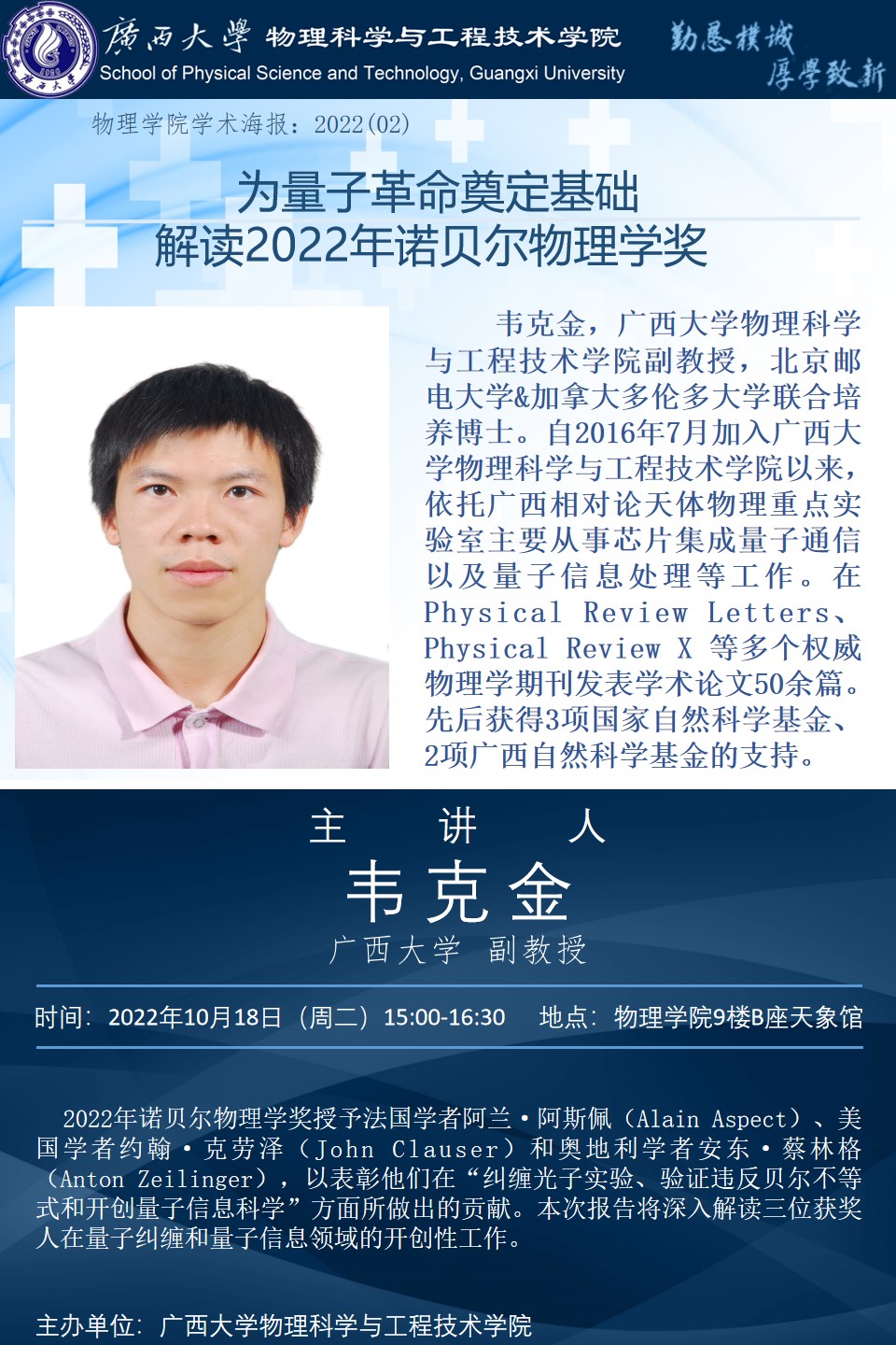物理科學與工程技術學院學術報告:為量子革命奠定基礎——解讀2022年諾貝爾物理學獎