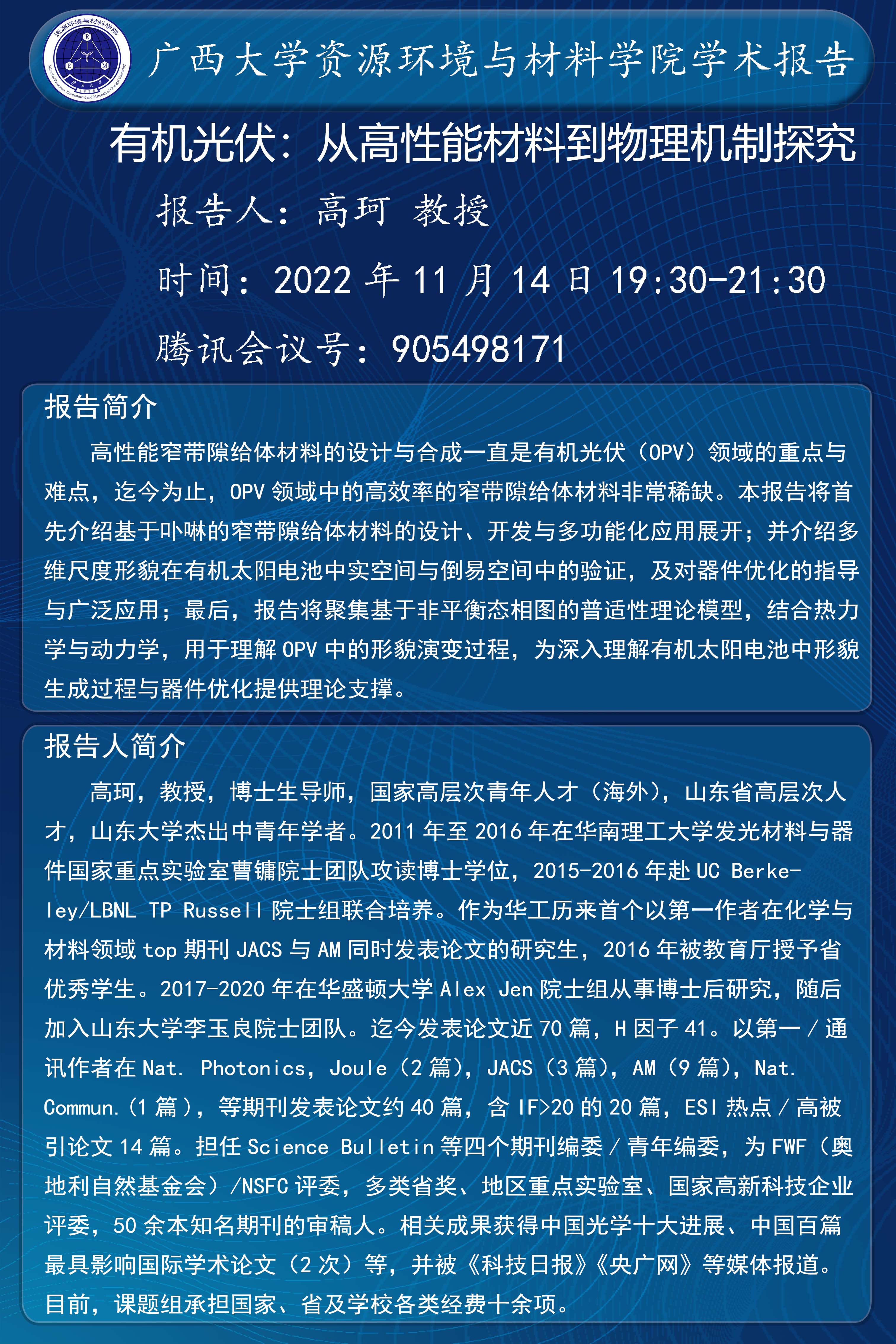 資源環(huán)境與材料學(xué)院學(xué)術(shù)報(bào)告:有機(jī)光伏:從高性能材料到物理機(jī)制探究