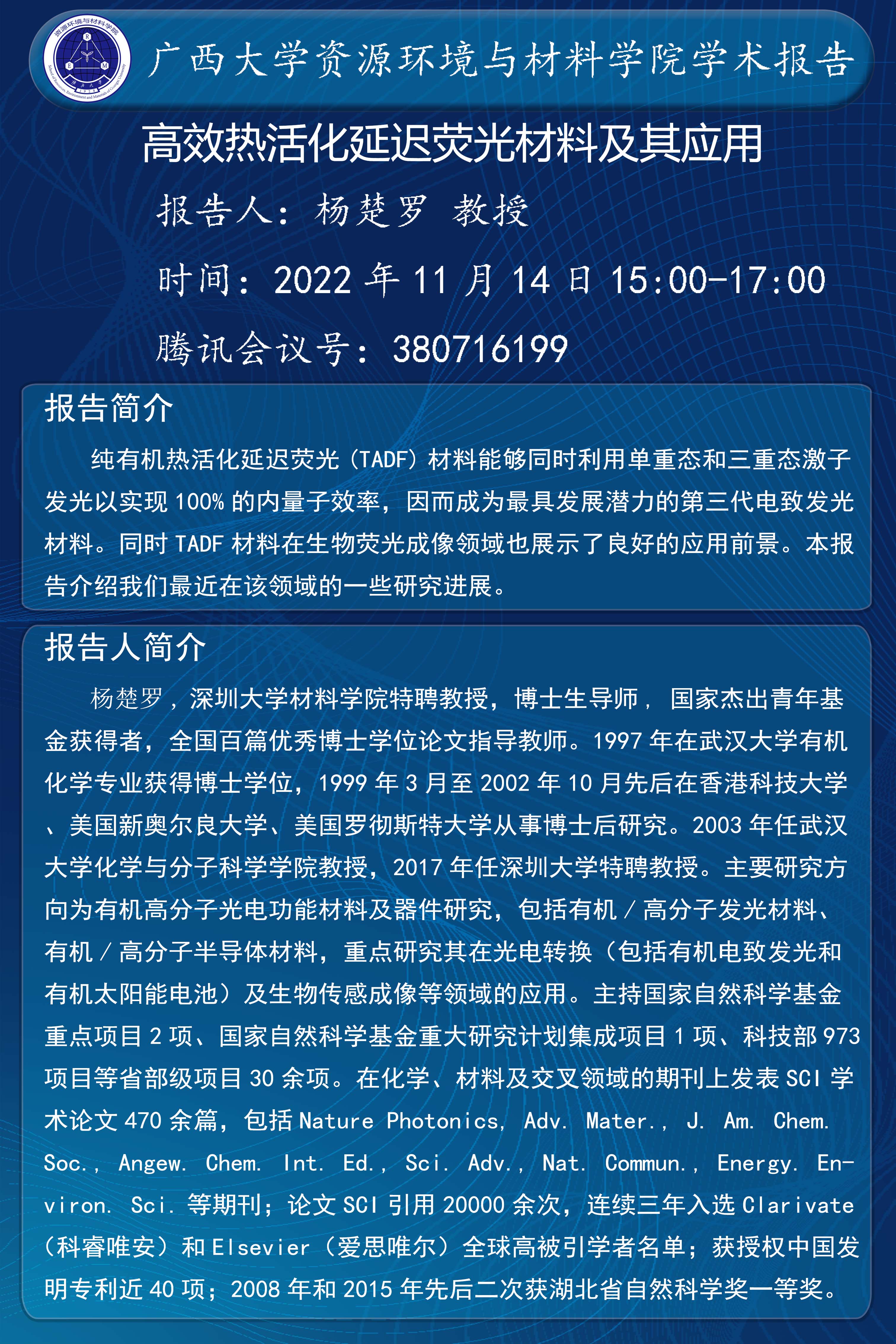 資源環境與材料學院學術報告:高效熱活化延遲熒光材料及其應用