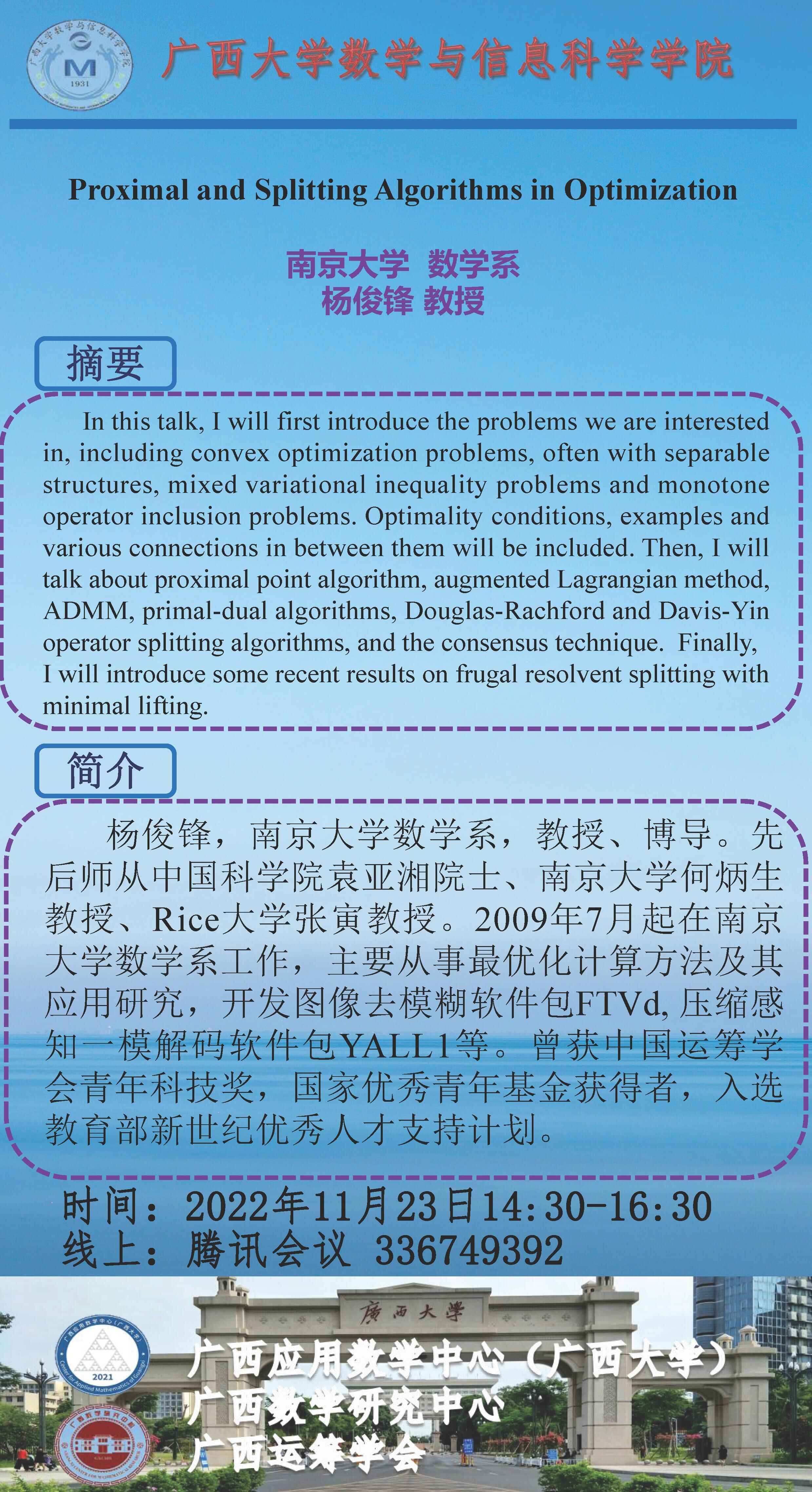 數學與信息科學學院/廣西應用數學中心(廣西大學)學術報告Proximal and Splitting Algorithms in Optimization