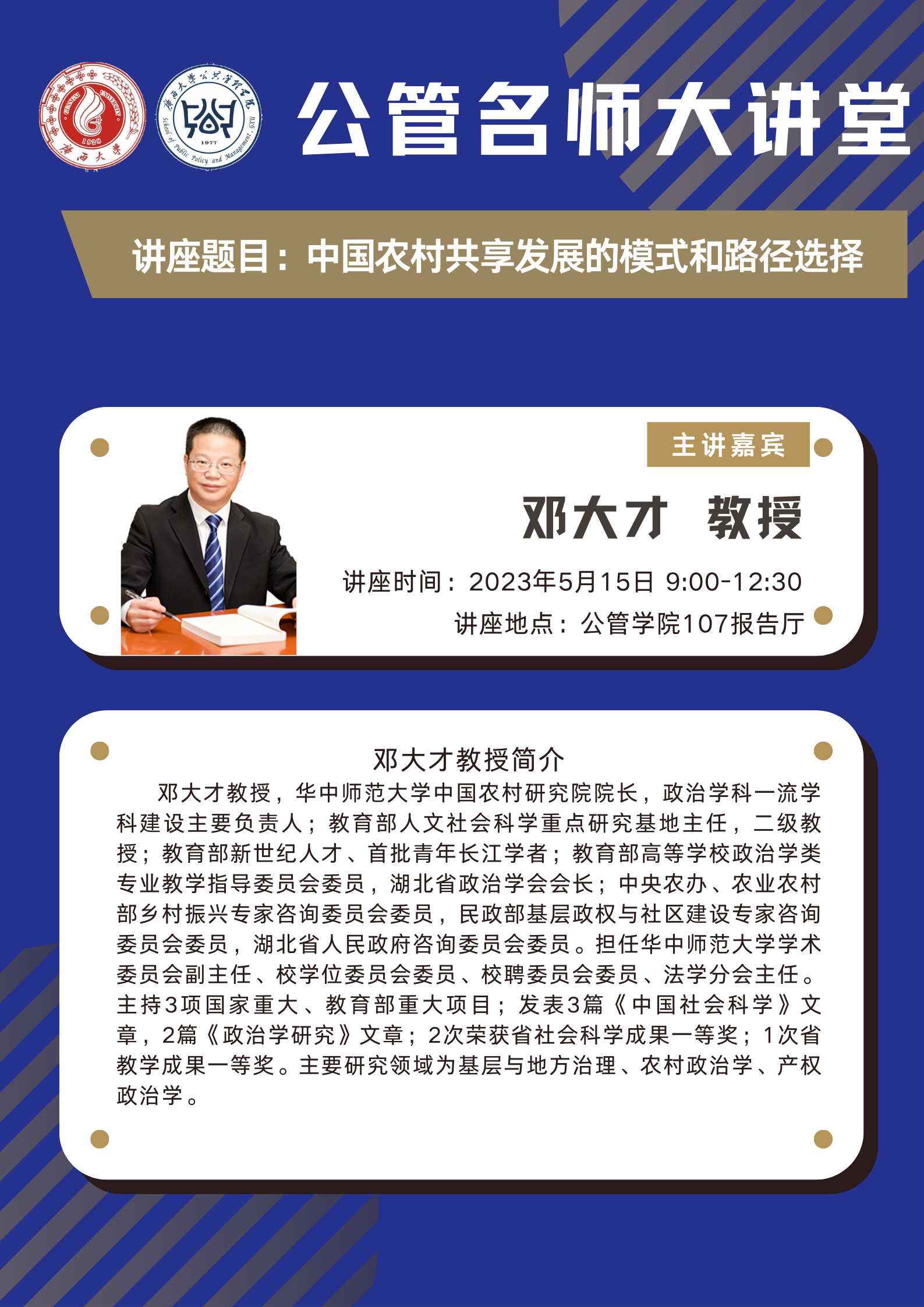 鄧大才教授,華中師范大學中國農村研究院院長, 政治學科一流學科建設主要負責人;教育部人文社會科學重點研究基地主任,二級教授;教育部新世紀人才、首批青年長江學者;教育部高等學校政治學類專業教學指導委員會委員,湖北省政治學會會長;中央農辦、農業農村部鄉村振興專家咨詢委員會委員,民政部基層政權與社區建設專家咨詢委員會委員,湖北省人民政府咨詢委員會委員。擔任華中師范大學學術委員會副主任、校學位委員會委員、校聘委員會委員、法學分會主任。主持3 項國家重大、教育部重大項目;發表3 篇《中國社會科學》文章,2 篇《政 治學研究》文章;2 次榮獲省社會科學成果一等獎;1 次省教學成果一等獎。主要研究領域為基層與地方治理、農村政治學、產權政治學。