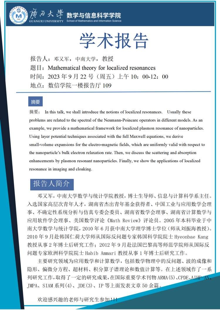 主講人 鄧又軍 地址 數信學院一樓報告廳109