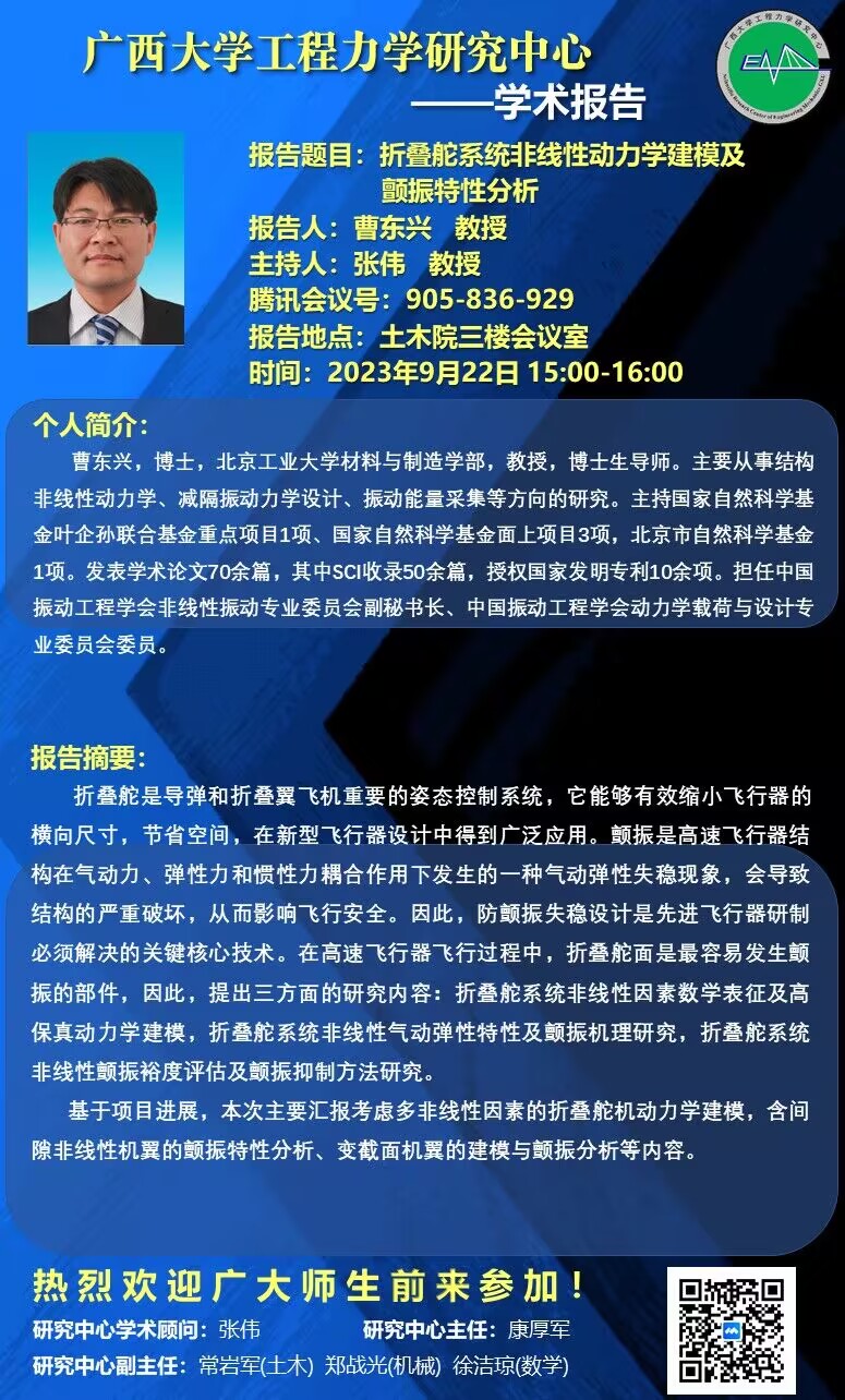 工程力學研究中心學術報告:折疊舵系統非線性動力學建模及顫振特性分析