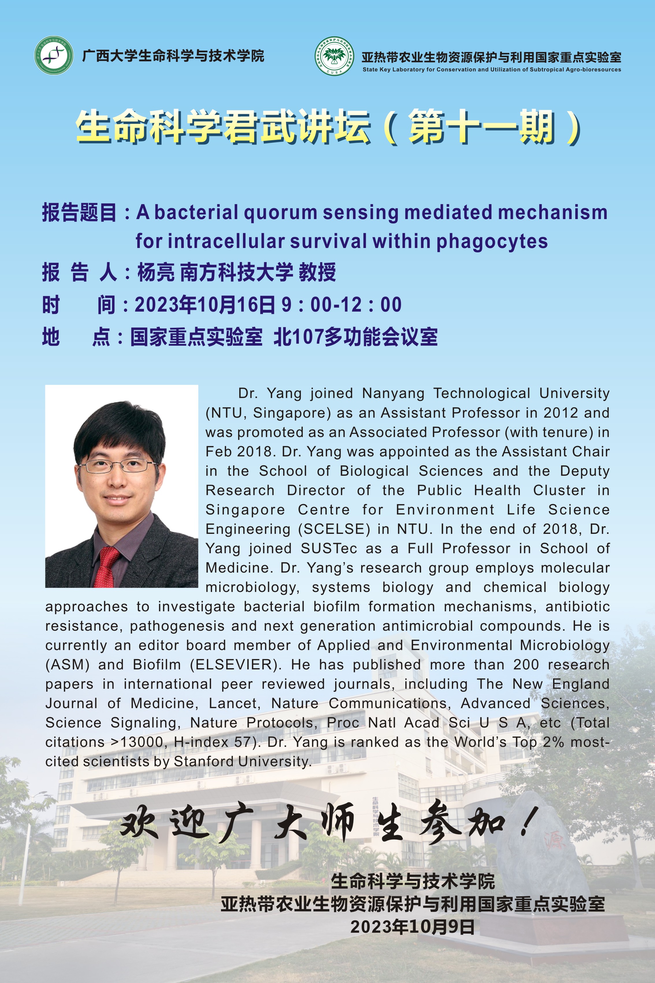生命科學(xué)君武講壇(第十一期):A bacterial quorum sensing mediated mechanism for intracellular survival within phagocytes