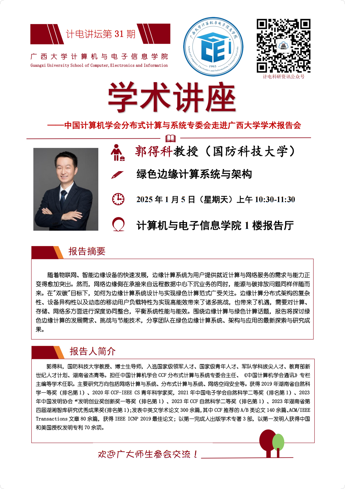 “計電講壇”系列活動第31期——中國計算機學會分布式計算與系統專委會走進廣西大學學術報告會:綠色邊緣計算系統與架構